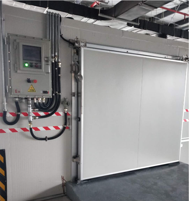 2、冷庫門:冷庫共計4扇雙面彩鋼冷庫門。庫門均含門框加熱絲,防爆等級ExdIBT4。門的尺寸不同,所用冷庫門材料相同,中型單開冷庫平移門1扇,雙面彩鋼板0.5mm100mm厚,內外雙鋁框,