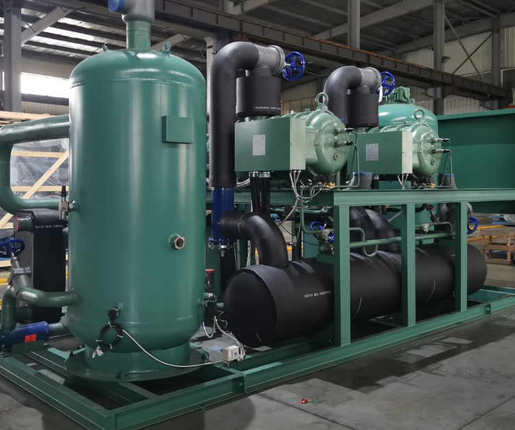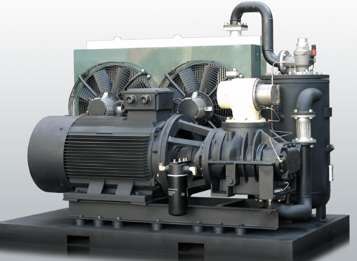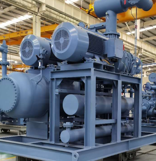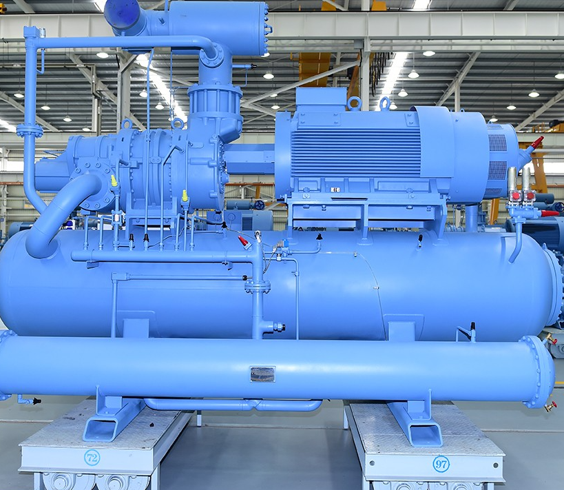 螺桿式制冷壓縮機的基本結構,主要由轉子、機殼、軸承、軸封、平衡活塞及能量調節裝置組成。兩個按一定傳動比反向旋轉又相互嚙合的轉子平行地配置在呈“&”字形的氣缸中。吸氣端座和氣缸上部設有軸向和徑向吸氣孔口,排氣端座和滑閥上分別設有軸向和徑向排氣孔口。壓縮機的吸、排氣孔口是按其工作過程的需要精心設計的,可以根據需要準確地使工作容積和吸、排氣腔連通或隔斷。